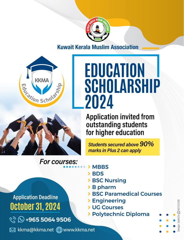 The Kuwait Kerala Muslim Association (KKMA) invites outstanding students to apply for the Education Scholarship 2024. This scholarship is aimed at supporting students who have secured above 90% in their Plus 2 exams and wish to pursue higher education in various fields.